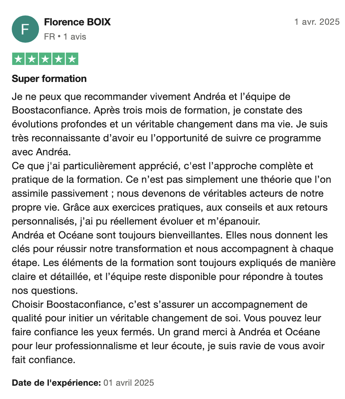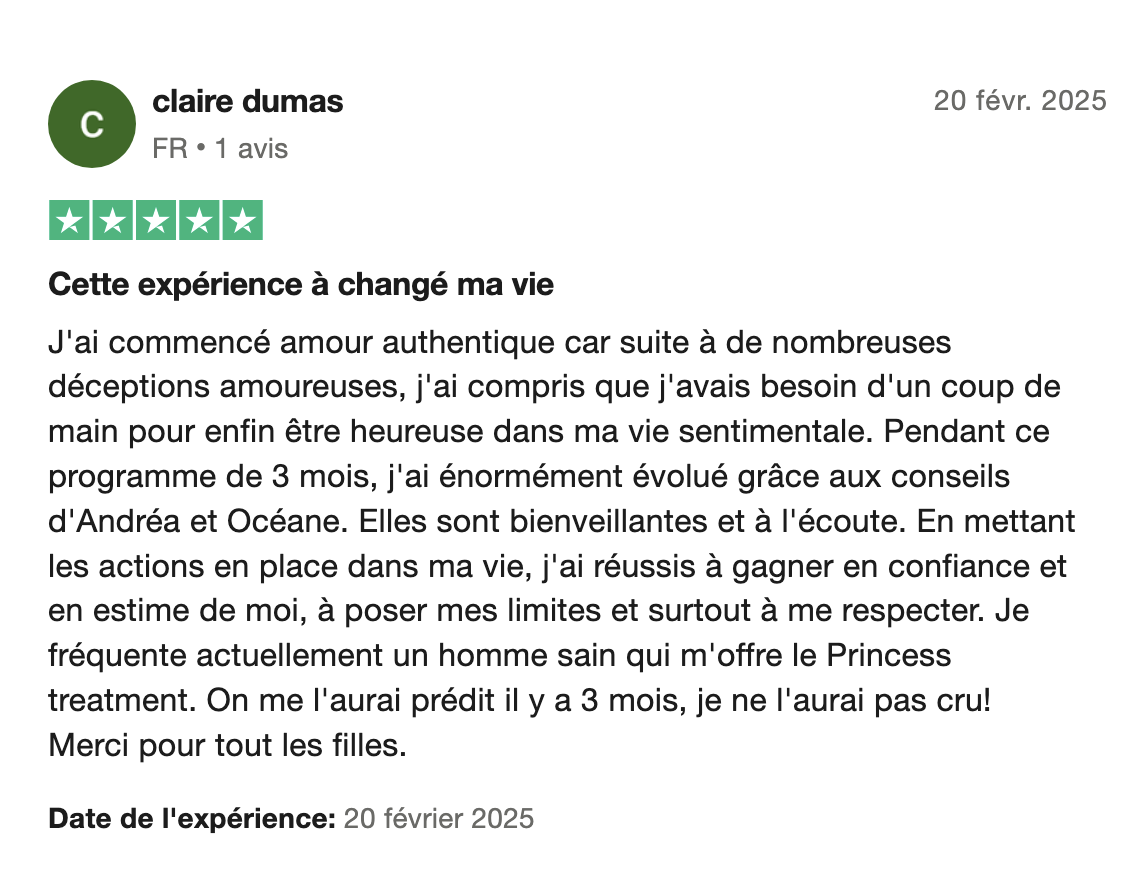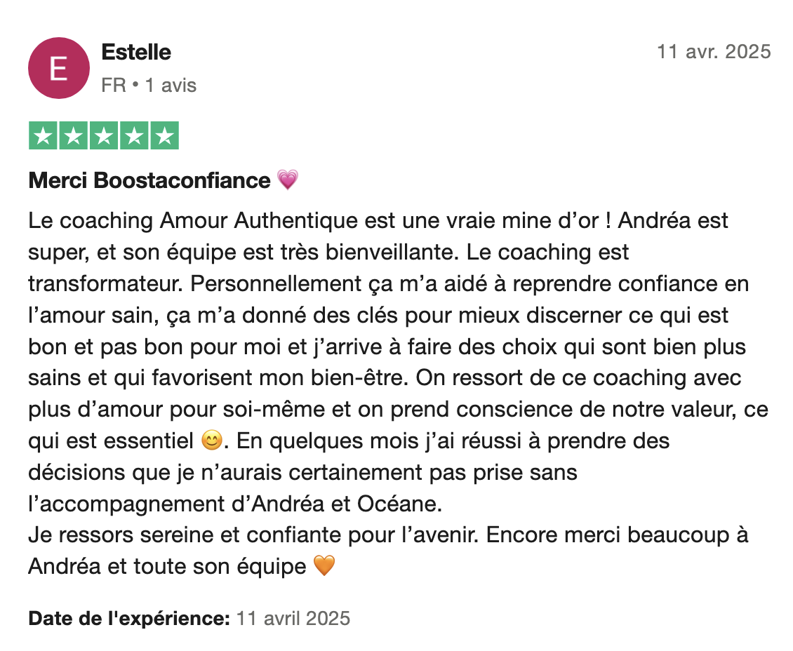 Aujourd'hui, elle a accompagné +1000 femmes à guérir leurs schémas, rompre le cycle de l'auto sabotage et à attirer une relation durable, sans se perdre.